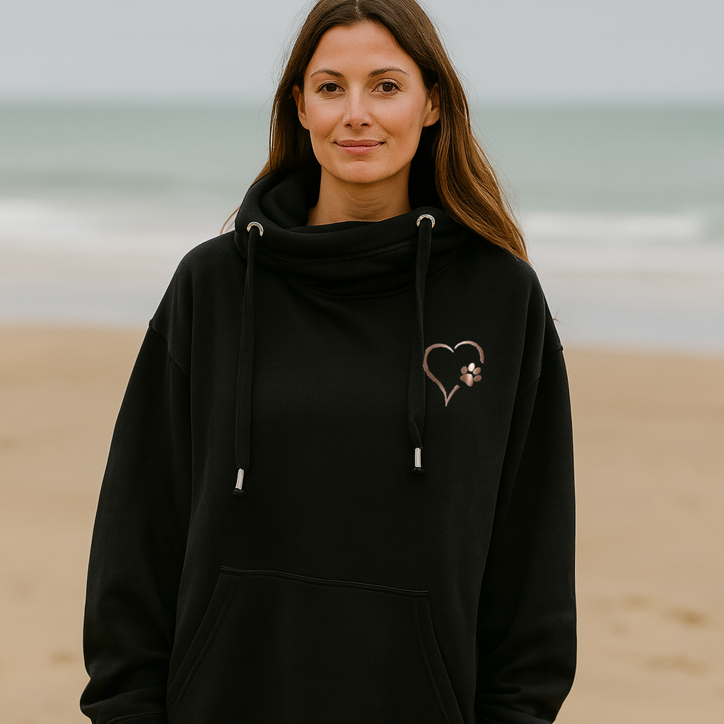 Keep extra cosy in our super luxury cowl neck hoodie featuring the beautiful rose gold heart and paw design.