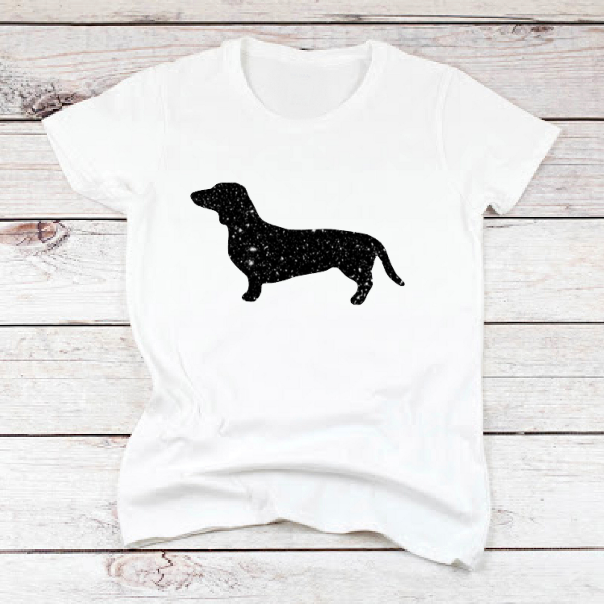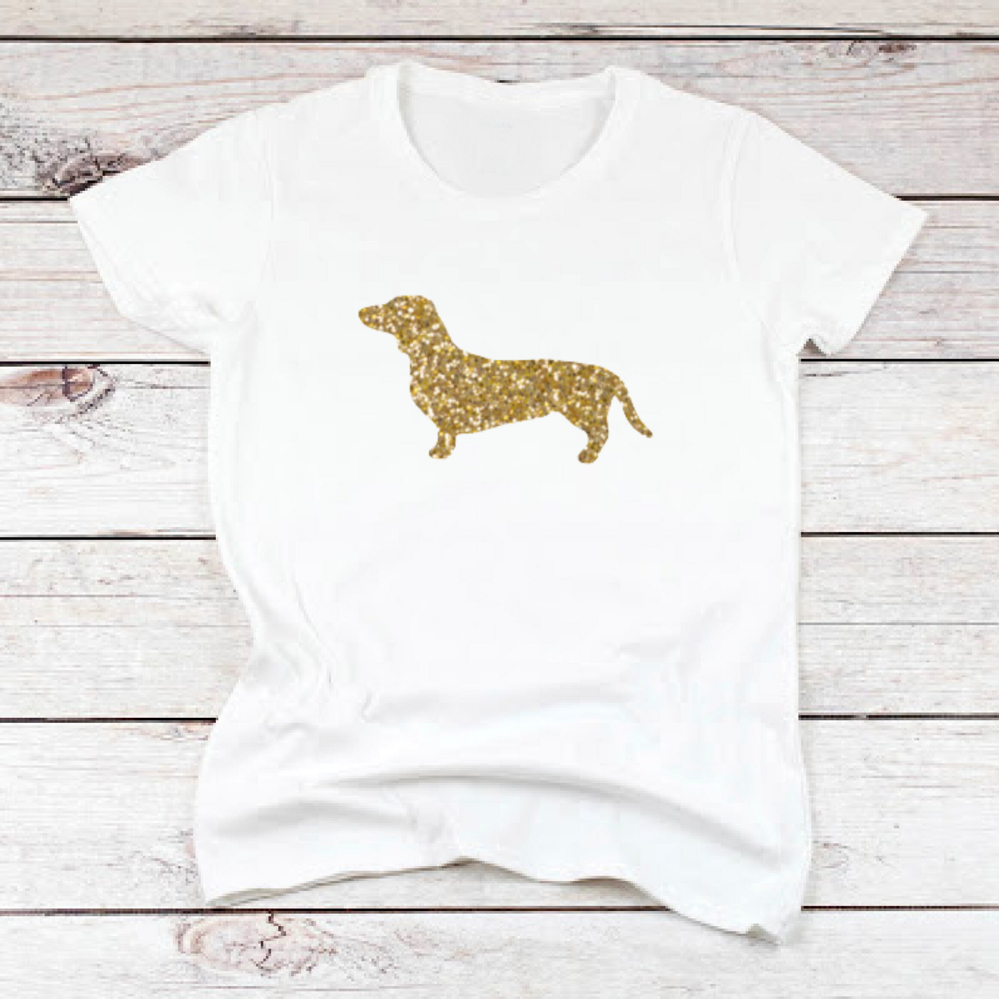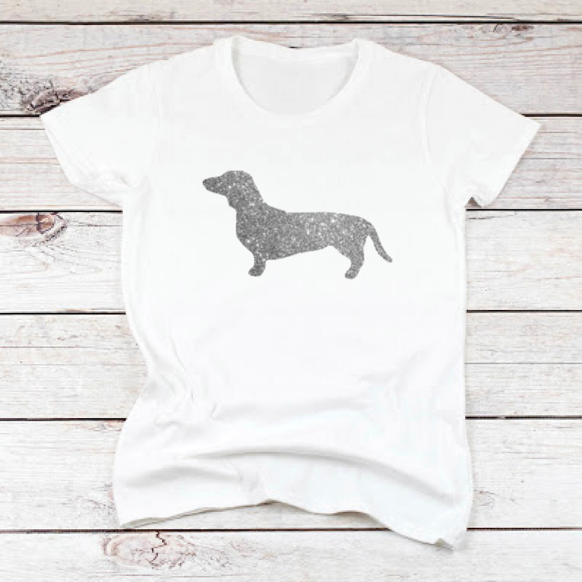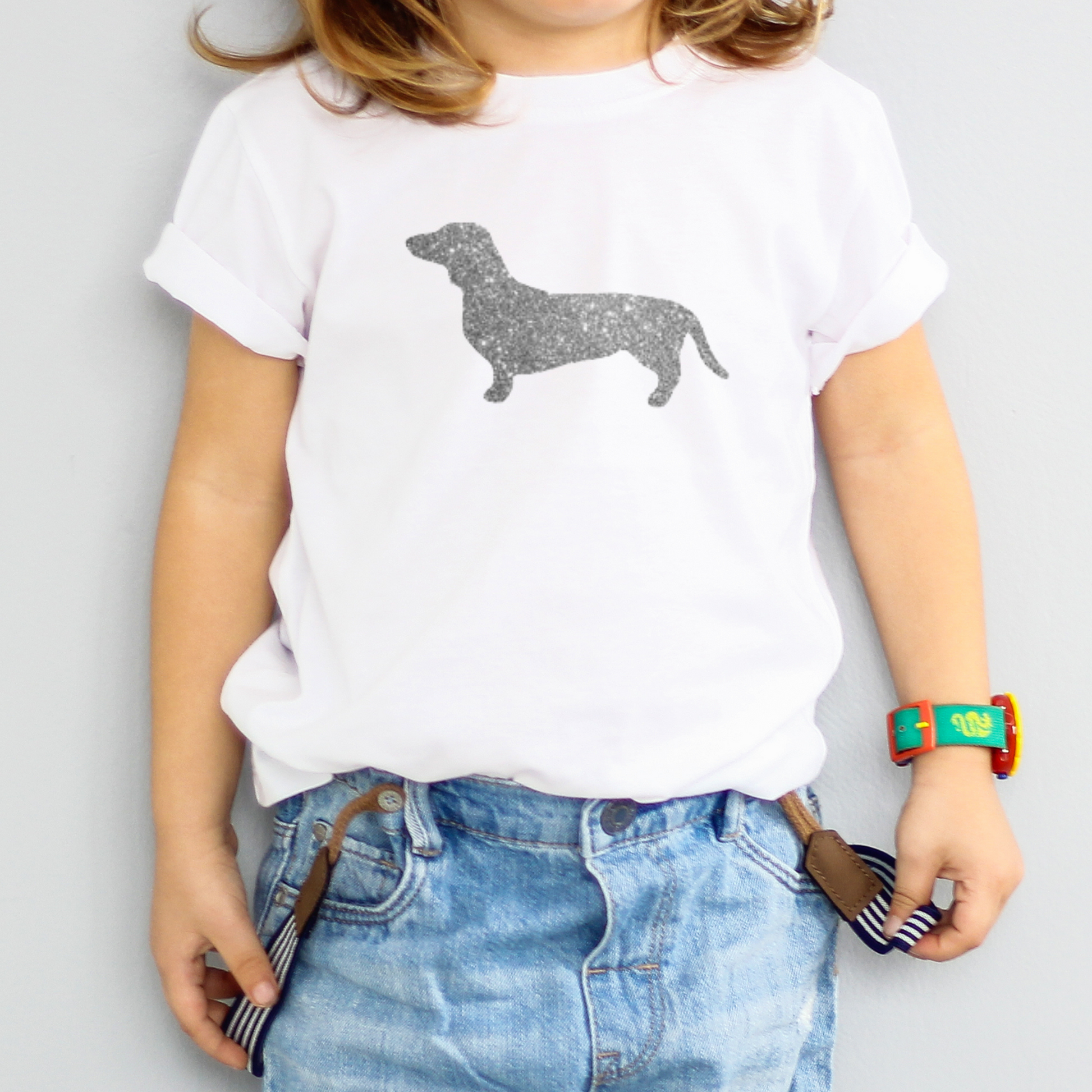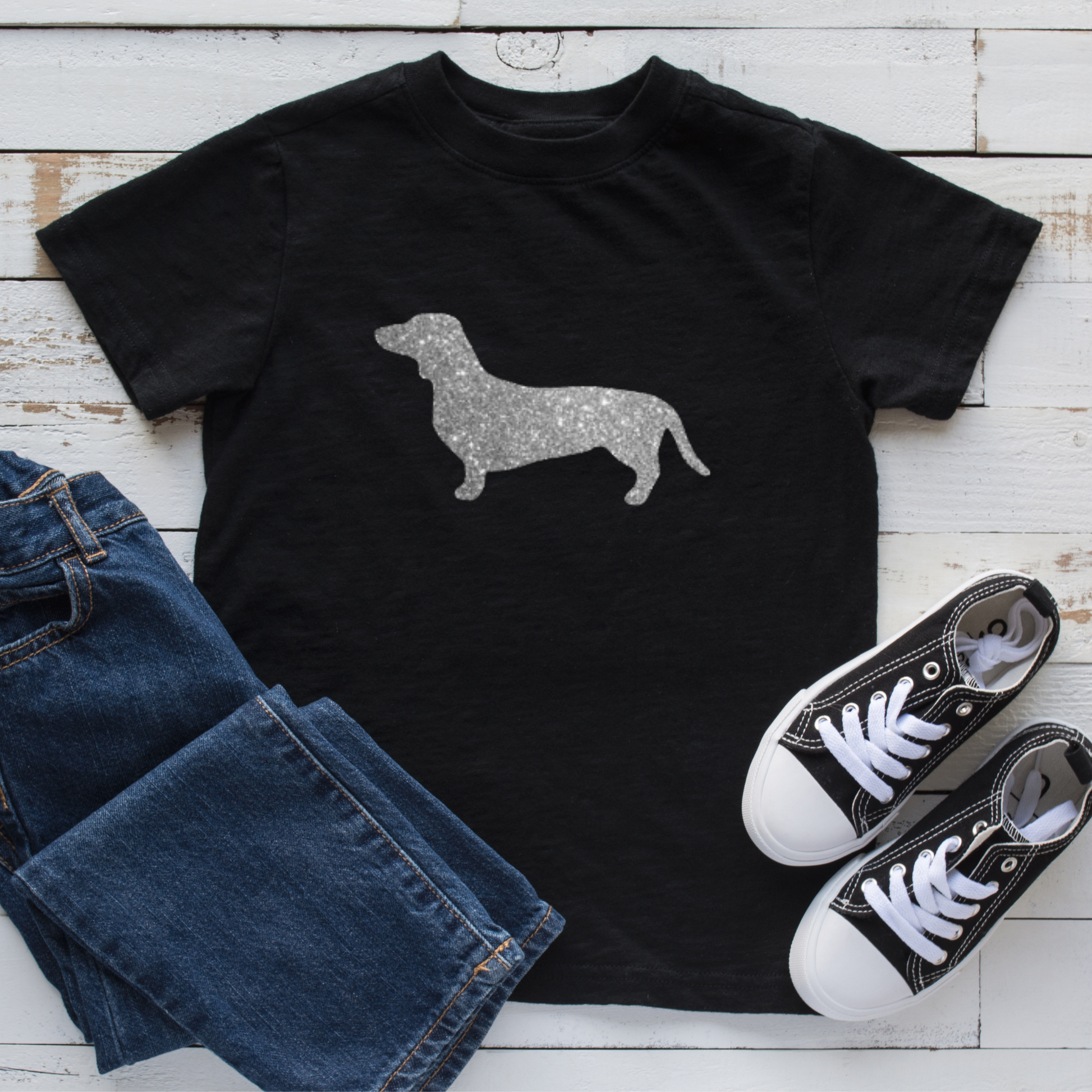 Available in Black or White, with a Gold, Silver or Black glitter dog. Matching adult shirts available.