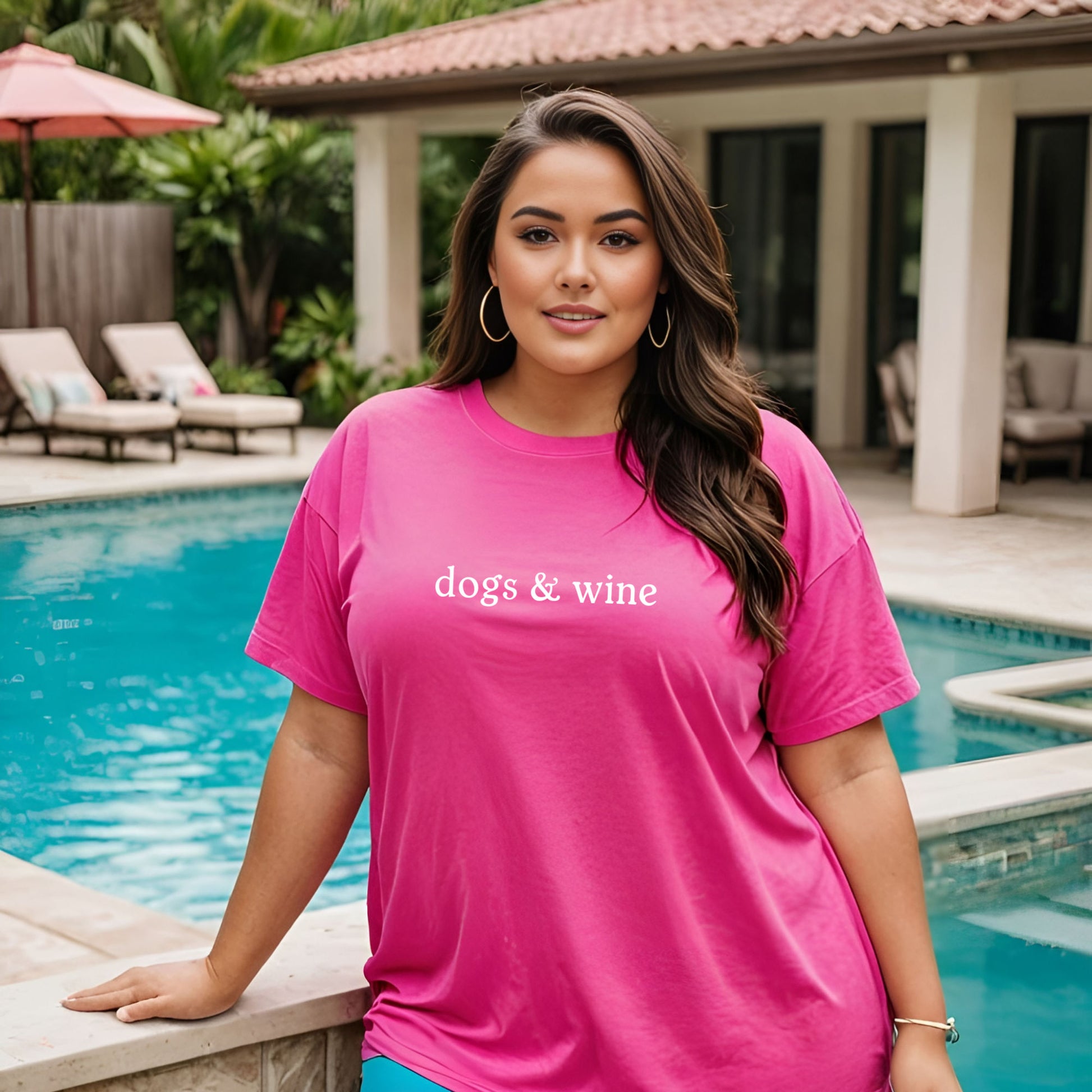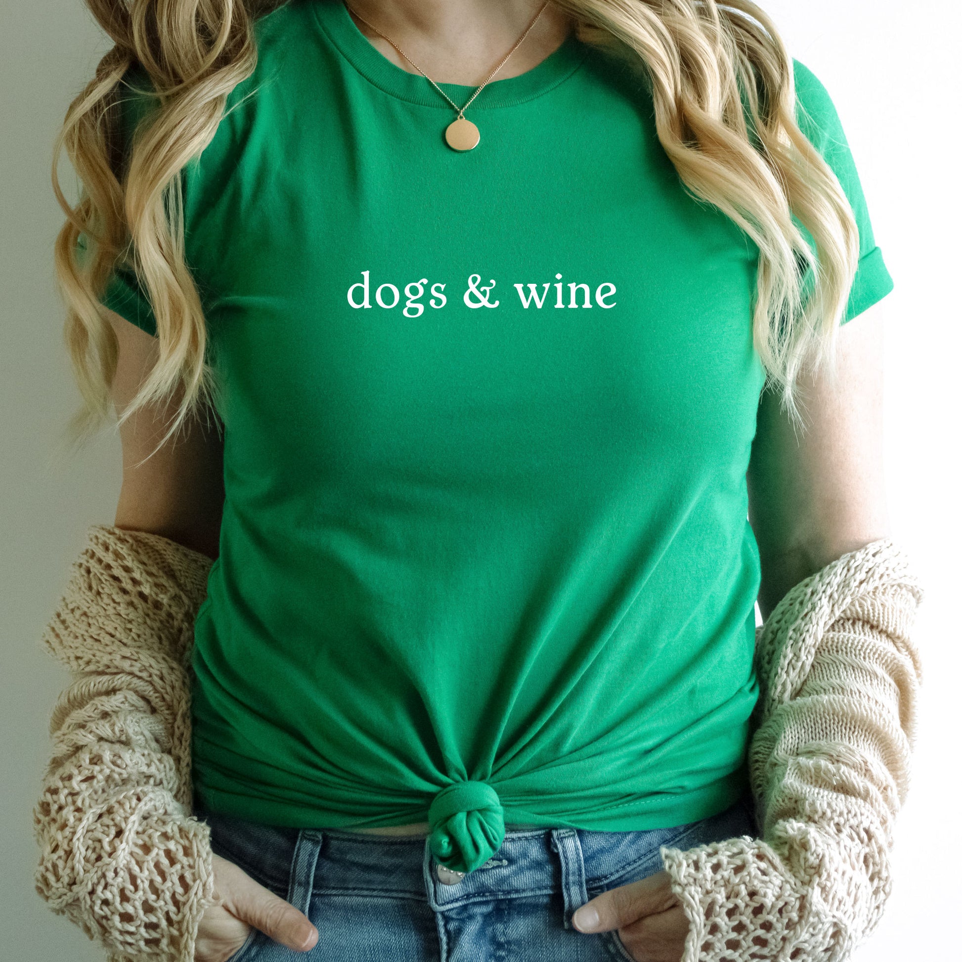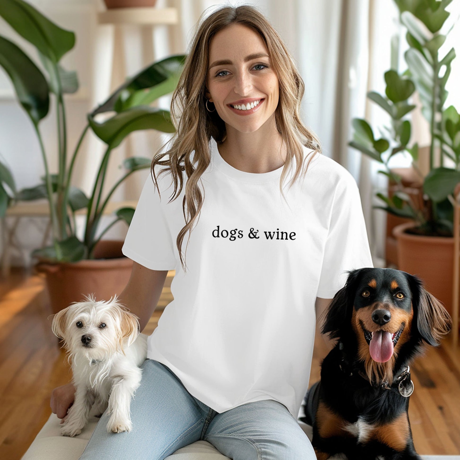 Lovely soft tee with the words 'Dogs and Wine'. A fun slogan present for your dog owner friends!