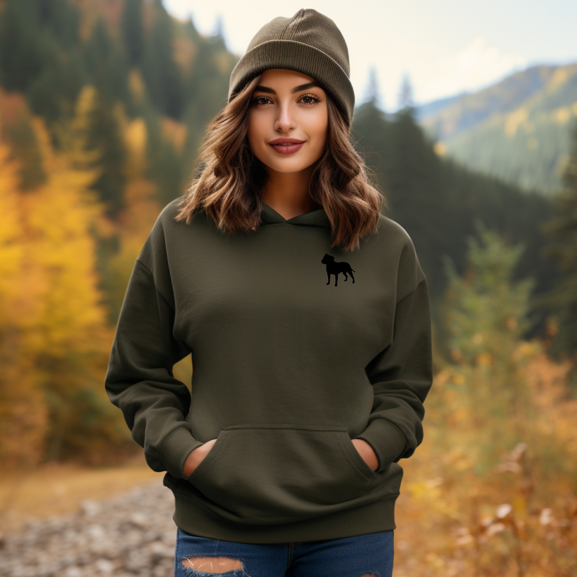 Hoodie featuring a black Staffordshire bull terrier motif.
