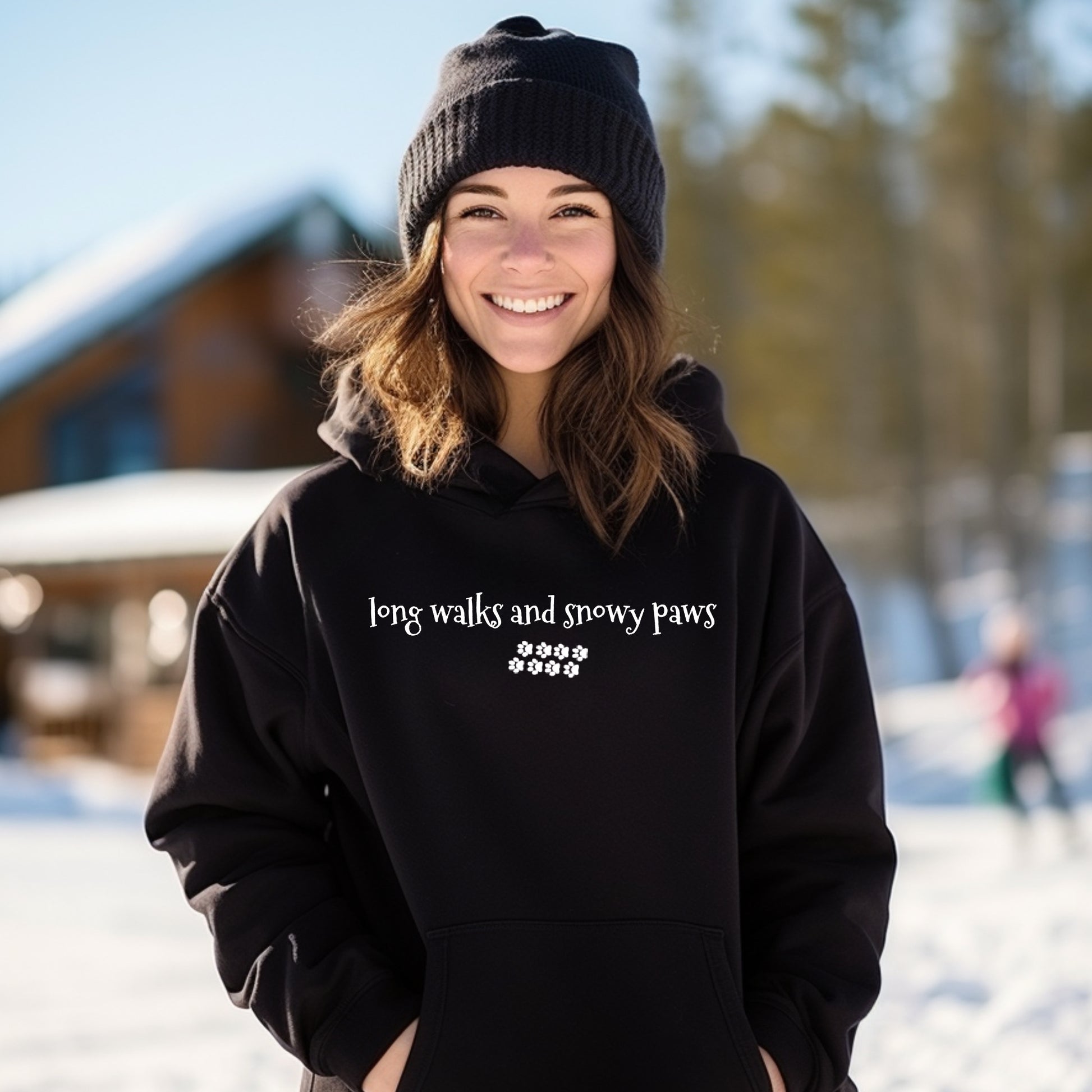 Hoodie featuring the slogan 'Long Walks and Snowy Paws'