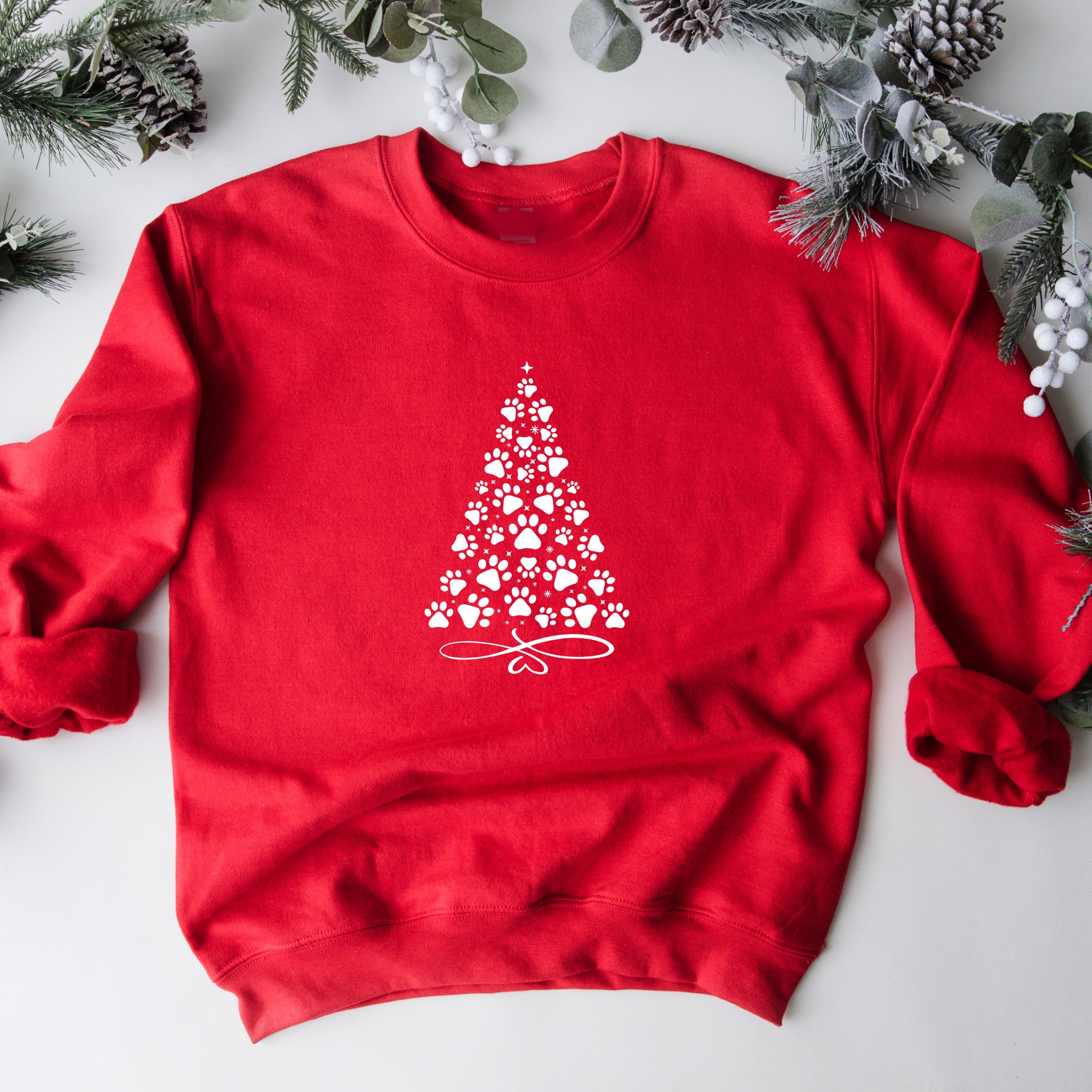 This is a great quality, unisex crew neck sweatshirt featuring a heart and paws Christmas tree.