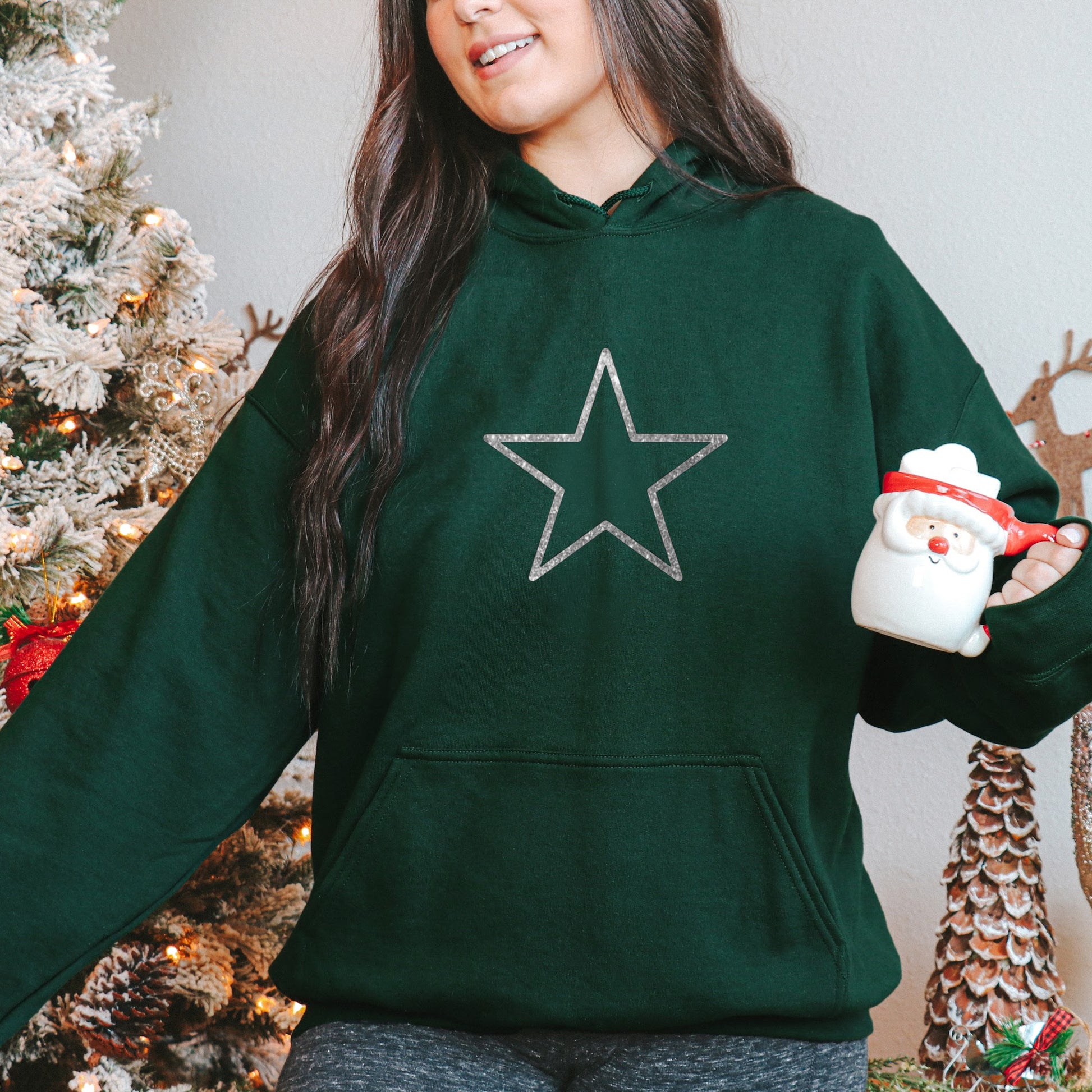 Get ready to shine this holiday season with our Christmas Star Hoodie! Made with a stunning glitter star design, this hoodie will add a touch of magic to any outfit. . A must-have for any Christmas lover!