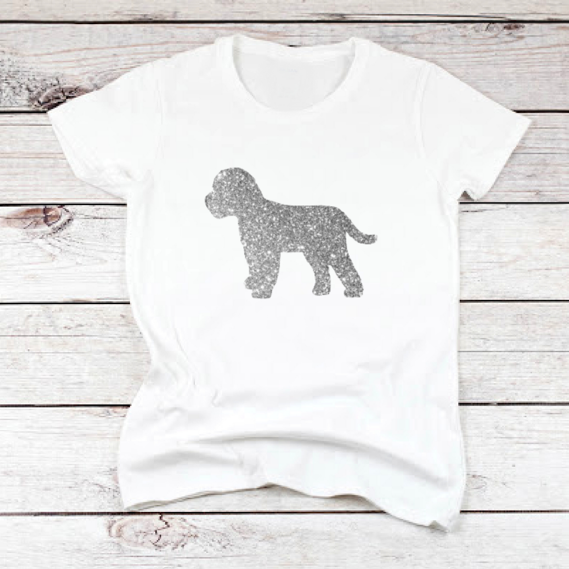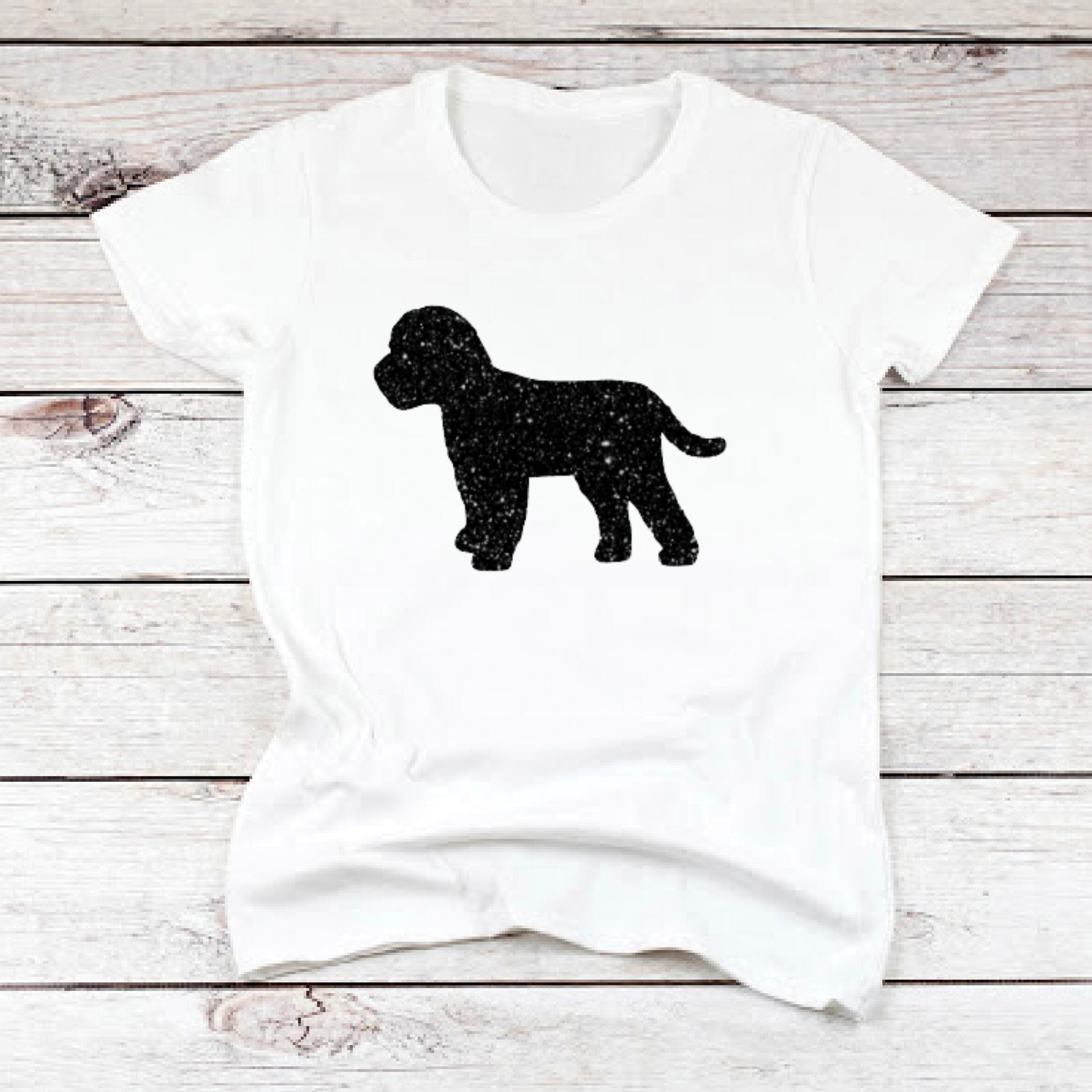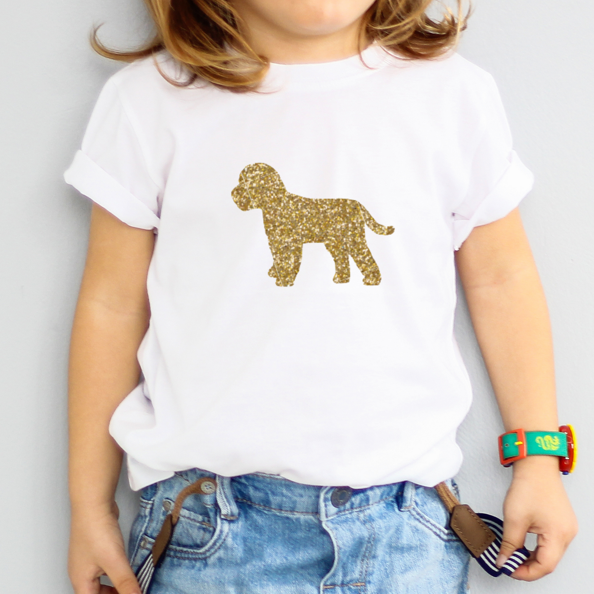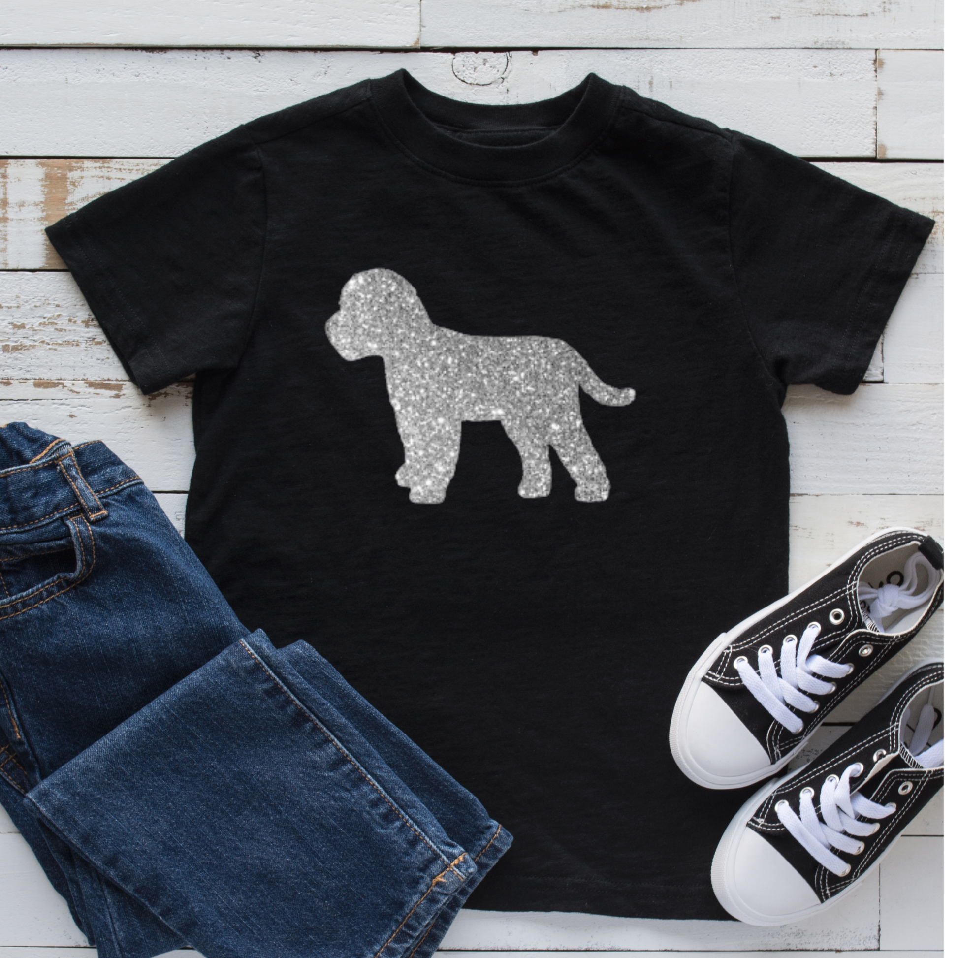 Available in Black or White, with a Gold, Silver or Black glitter dog. Matching adult shirts available.