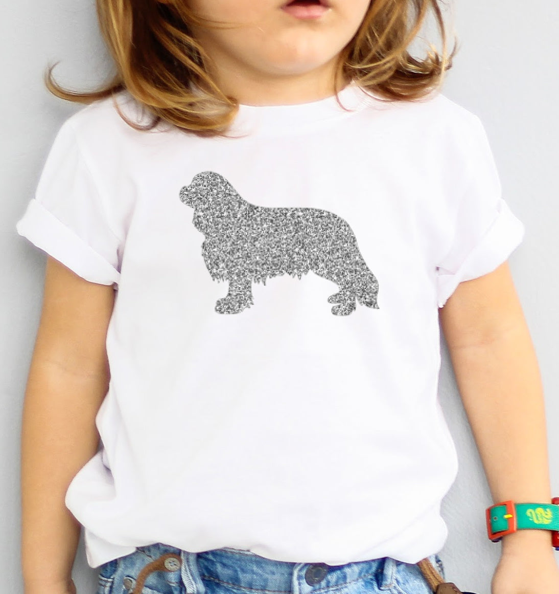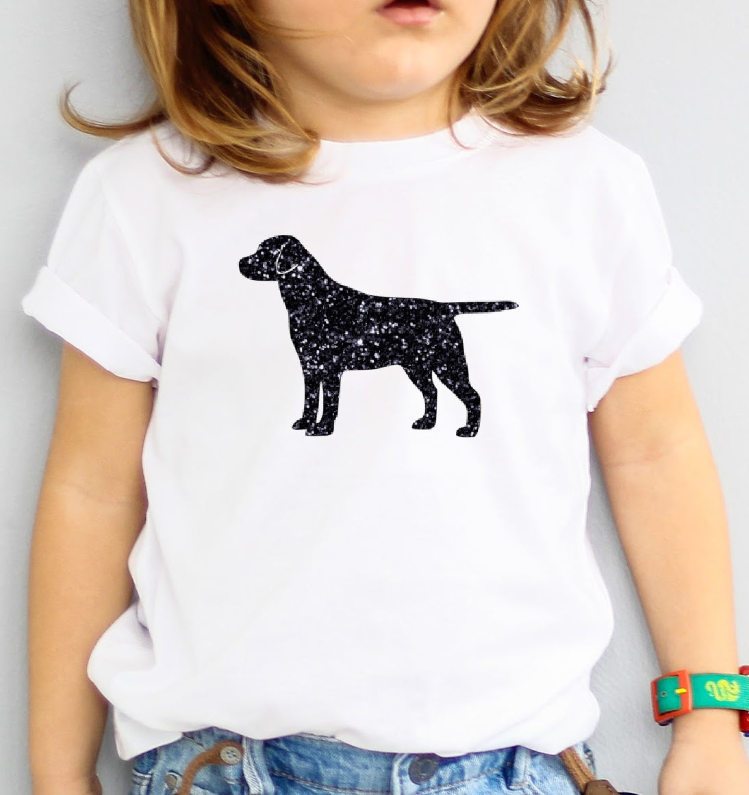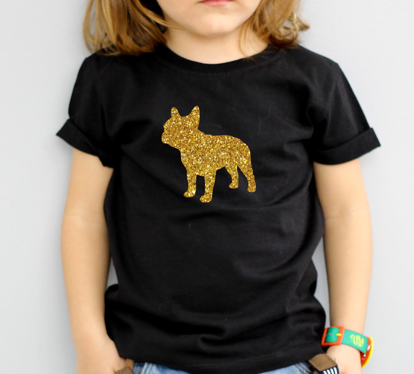 Available in Black or White, with a Gold, Silver or Black glitter dog. Matching adult shirts available.