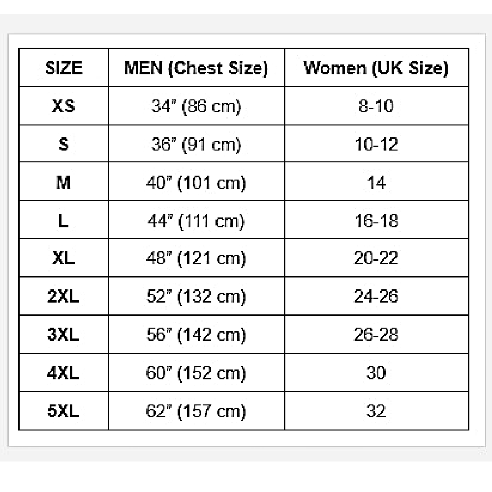 XS (34"), S (,36"), M (40"), L (44") XL (48"), 2XL (52"), 3XL (56"), 4XL (60"), 5XL (62")